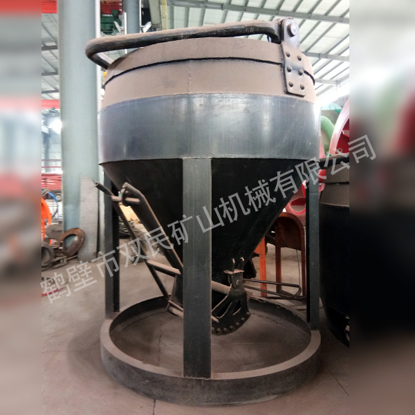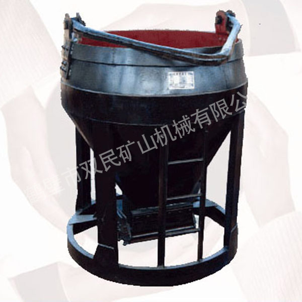 底部卸料斗由電力機車或其他牽引方式放置在平礦車上,位于井口棚與混凝土攪拌站之間。鏟斗由斗體、斗梁、扇門、閘門啟閉手柄和鎖緊機構組成。礦斗是豎井開挖中提升矸石、提升人員和物料的主要容器。當井筒涌水量小于6M3/h時,也可用于排水。根據(jù)卸矸石形式的不同,斗分為鉤斗、鉤斗。
