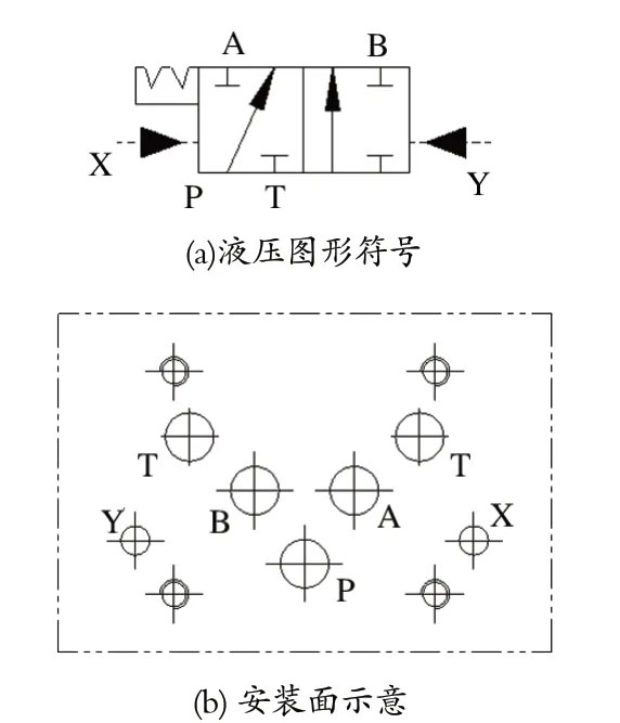 雙泵液壓站上使用的板式液動換向閥安裝在閥組油路塊上,通過油路塊上設計的油孔及螺釘安裝孔進行連接。圖2 所示為 23Y 型板式液動換向閥,其安裝面上油口眾多。當然,進口廠家也有板式液動換向閥可供選擇,但是其安裝面上同樣油口眾多。美國PARKER 的 D3DP26D2N 板式液動換向閥如圖3 所示,該換向閥在雙泵液壓站上也有使用。A 口、B 口和 P 口為閥的工作油口,X 口和 Y 口為控制油口。安裝面上油口眾多,這給閥組油路塊的油孔設計增加了難度。此外,板式液動換向閥還存在閥芯容易卡阻、彈簧使用壽命短等問題,這都是制動系統(tǒng)運行中存在的安全隱患。