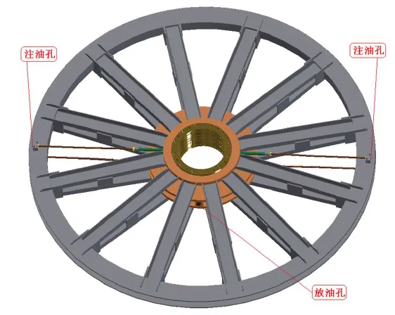 1.8 天(導向)輪軸瓦的維護 天(導向)輪生產(chǎn)完成后到到用戶安裝使用,一般會滯留一段時期,此時管路中及軸瓦內(nèi)在制造廠所加的潤滑脂很可能已經(jīng)變質失效、風干、附著在油管內(nèi)壁和軸瓦油槽中,甚至形成堵塞,因此在使用前需要對潤滑管路及軸瓦進行清洗,保證潤滑油路的暢通。清洗時,將煤油等清洗劑通過輪緣上注油孔注入,游動輪輪轂中部設有2-M33×2出油口(此口也可以做注油口使用),清洗完成后用螺塞堵住。