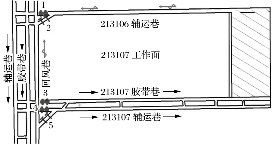 以213107 工作面為例,分別在 213106 輔運(yùn)巷安裝 2 道風(fēng)門(mén),213107 膠帶巷安裝 1 道風(fēng)門(mén),在 213107輔運(yùn)巷及專回各安裝 1 道風(fēng)門(mén)。采煤工作面風(fēng)流優(yōu)化系統(tǒng)如圖4 所示。其中編號(hào) 1、3、4 為自吸風(fēng)門(mén);編號(hào) 2、5 為自調(diào)節(jié)風(fēng)門(mén)。正常通風(fēng)時(shí),打開(kāi) 2、3、4 等風(fēng)門(mén),形成 U 形全負(fù)壓通風(fēng),關(guān)閉 1、5 風(fēng)門(mén)形成閉合回路;發(fā)生災(zāi)變需要反風(fēng)時(shí),則打開(kāi)關(guān)閉的 1、5風(fēng)門(mén),形成風(fēng)向逆流,由 1 號(hào)風(fēng)門(mén)進(jìn)風(fēng),5 號(hào)風(fēng)門(mén)回風(fēng),其余 2、3、4 號(hào)風(fēng)門(mén)關(guān)閉,可實(shí)現(xiàn)反風(fēng)效果。