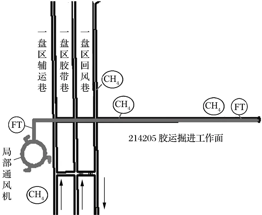 3.3.3 掘進(jìn)工作面優(yōu)化方案 在掘進(jìn)工作面新鮮風(fēng)流進(jìn)風(fēng)側(cè)安裝有 2 臺(tái)變頻軸流式局部通風(fēng)機(jī),在巷道風(fēng)門(mén)里正頭、專回口安裝有甲烷傳感器。對(duì)風(fēng)筒安裝風(fēng)壓傳感器,結(jié)合掘進(jìn)期間實(shí)際瓦斯涌出量和濃度指標(biāo),系統(tǒng)自行計(jì)算供風(fēng)量是否滿足風(fēng)排瓦斯需求,通過(guò)變頻實(shí)現(xiàn)風(fēng)量調(diào)節(jié)。掘進(jìn)工作面優(yōu)化布置如圖6 所示。