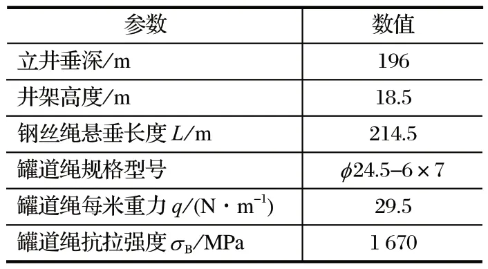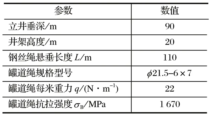 試驗項目一用于鄭煤集團教學二礦西副井的罐道繩,其參數(shù)如表1 所列。該試驗主要測試罐道繩的張力,計算罐道繩的zui小剛性系數(shù),根據(jù)結(jié)果調(diào)整鋼絲繩,直至符合《煤礦安全規(guī)程》要求。