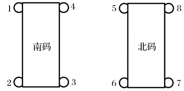 南北兩碼罐籠各有 4 根、共 8 根鋼絲繩罐道,罐道繩的分布圖如圖6 所示。測試結(jié)果如表4 所列。