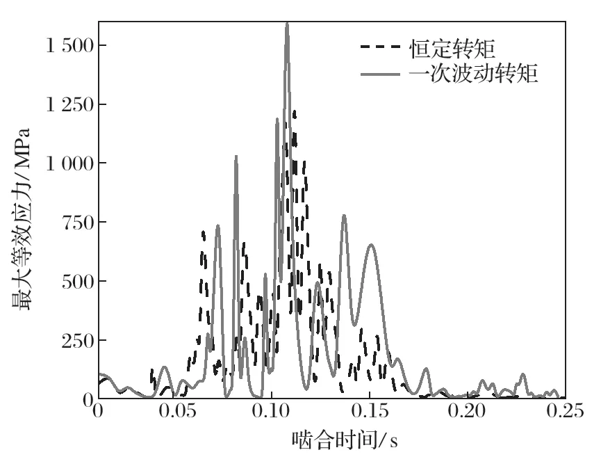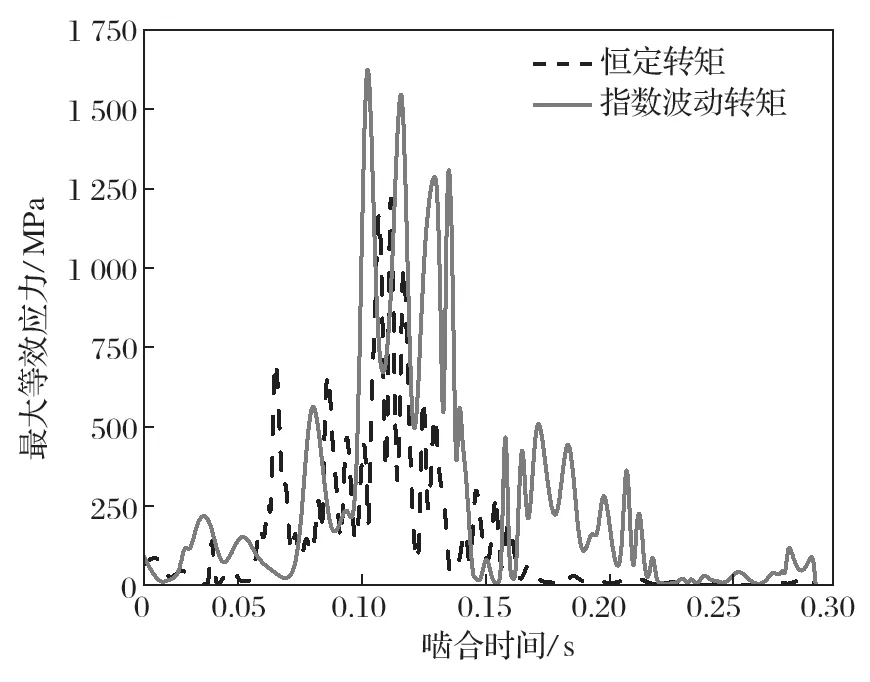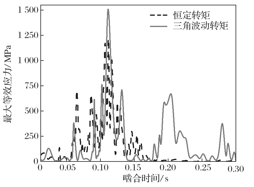 在有限元模型中,利用探針提取從動輪一個齒面與一個齒根面的zui大等效應力。觀察恒定轉矩的zui大等效應力變化,當齒輪嚙合時間到達0.11s 時,位于從動輪齒面與齒根面的zui大等效應力達到zui大,zui大等效應力處于齒根處;應力的變化趨勢整體呈現出金字塔形;隨著同步齒輪嚙合的進行,zui大等效應力的幅值逐步升高;達到zui高點之后,應力幅值又逐步降低,表明嚙合過程的結束。因為齒輪嚙合過程中是單齒對接觸與兩齒對接觸交替出現形式,所以會出現zui大等效應力的波動。當處于單齒對接觸時,應力波動大,同時應力值將達到zui大;在雙嚙合區(qū),其所受載荷與接觸壓力較平穩(wěn),受到沖擊較小,且應力波動較小。