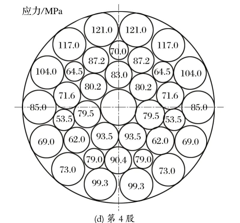 將鋼絲繩纏繞在直徑為 2 m 的天輪上,在實(shí)際求解時,將計算內(nèi)部接觸點(diǎn)位置作為求解的計算點(diǎn)。此時,選取位于摩擦天輪繩槽上下兩側(cè)和右側(cè)的部分繩股作為研究對象,并且沿著順時針方向進(jìn)行標(biāo)記,標(biāo)記出第 1、2、3、4 股。仿真分析得到的鋼絲繩應(yīng)力分布如圖4 所示。