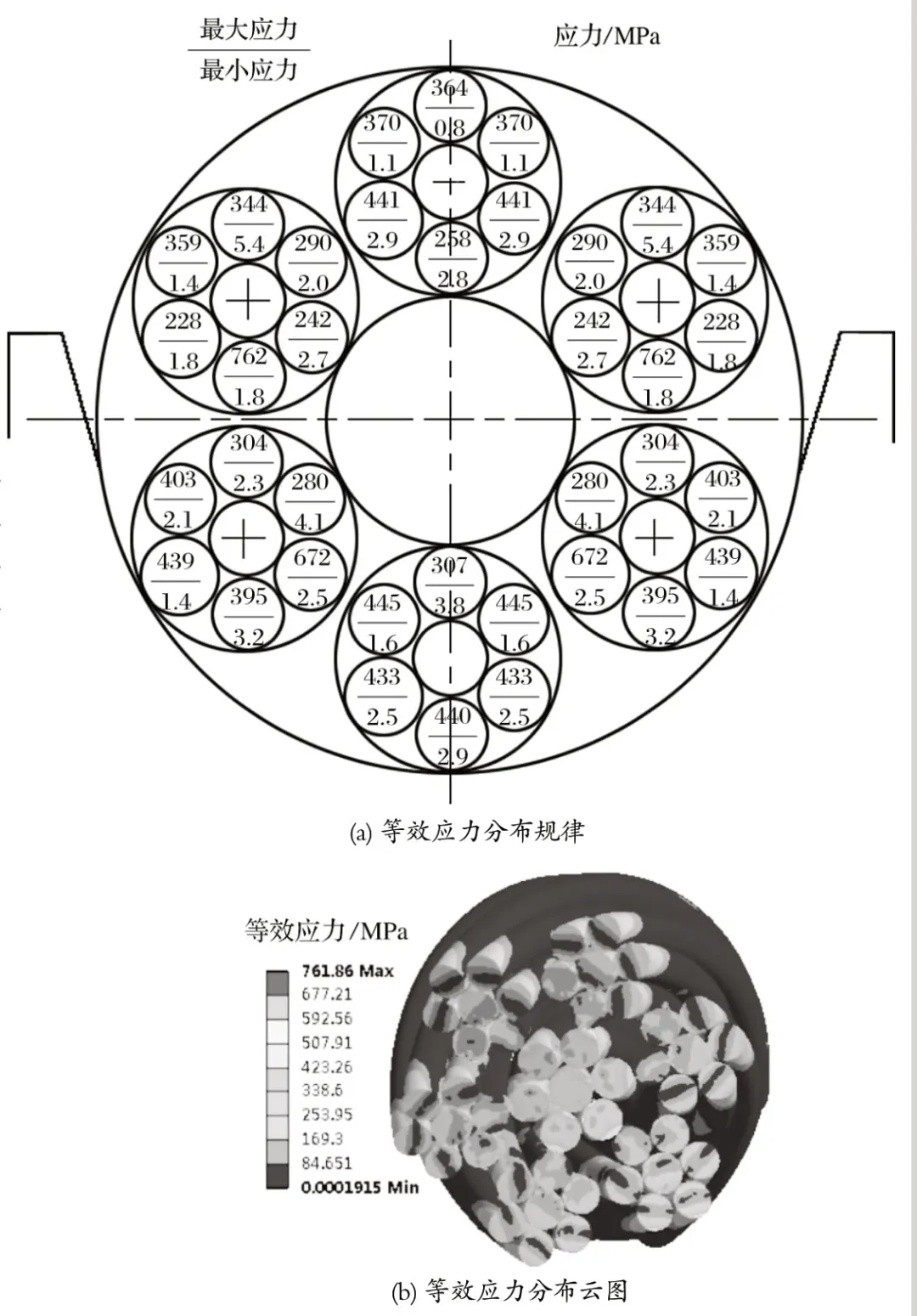 從圖6(a) 可以看出,鋼絲繩在受載作用時,此時的等效應(yīng)力呈現(xiàn)出不均勻的分布形式,且存在層狀分布;鋼絲繩的應(yīng)力受到空間位置和相位變化的影響,在繩槽的中 心軸線上下部分分布不均勻;從圖6(b) 可以看到,鋼絲繩截面上應(yīng)力近似呈現(xiàn)對稱層狀分布,彈性區(qū)域和塑性區(qū)域相互交叉。鋼絲繩的外股層和接觸位置的應(yīng)力比其他同股的應(yīng)力較大,此時zui大值為 761.97 MPa,zui大應(yīng)力分布在靠近中 心軸軸線上半部分的左右兩側(cè)。鋼絲繩的交互捻外層股二次捻制鋼絲繩中,靠近繩芯的位置應(yīng)力比較大,zui大應(yīng)力是1 121.78 MPa,分布在繩槽中 心軸線上半部分。通過對比圖4 可以看出,zui大應(yīng)力主要集中在鋼絲繩的外側(cè),不同繩股層的鋼絲繩應(yīng)力值不同。