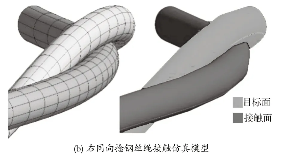 實際加載時,右同向捻的鋼絲繩一端固定,在鋼絲繩的一端進(jìn)行加載。從圖7(a) 可以看出,此時,加載端的鋼絲繩產(chǎn)生與繩股捻制方向相反的變形,并且在繩槽底部接觸位置的應(yīng)力較大,這個應(yīng)力是使鋼絲繩出現(xiàn)扭轉(zhuǎn)變形的主要原因。所以說,靠近繩槽底部的變形其實是比較小的。此外,整個系統(tǒng)中位于繩槽位置處的位移變化相對較大。從圖7(b) 可以看出,鋼絲繩和天輪在接觸位置處受到集中應(yīng)力的作用,呈現(xiàn)出層狀的分布規(guī)律;在鋼絲繩和天輪接觸點內(nèi)側(cè)表現(xiàn)為壓應(yīng)力,外側(cè)表現(xiàn)為拉應(yīng)力,并且同向捻制鋼絲繩股內(nèi)變形大于右交互捻;鋼絲繩的外層絲等效應(yīng)力表現(xiàn)出等幅波動,幅度變化也呈現(xiàn)出一定的規(guī)律性;在鋼絲繩模型加載位置端和約束端面上,受到約束作用,導(dǎo)致應(yīng)力突然集中,在端面位置的等效應(yīng)力其實是大于股內(nèi)鋼絲其他位置的等效應(yīng)力。