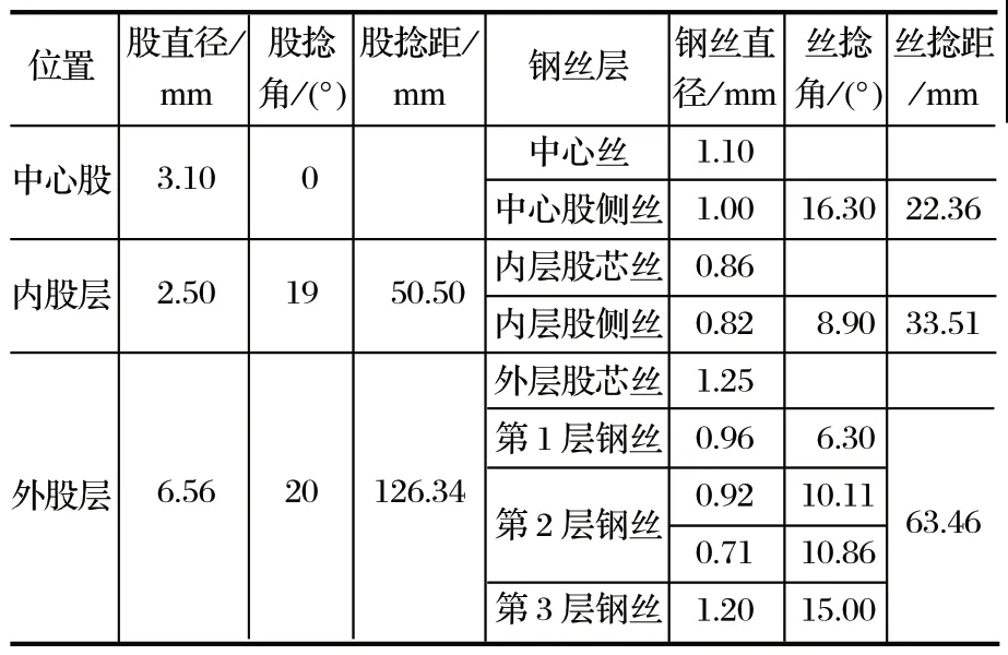 從表2 可以看出,鋼絲繩主要分為 3 層,中 心股、內(nèi)股和外股;3 股的直徑不同,并且股捻距也存在一定的差異。在進(jìn)行仿真求解時,需要對各個層進(jìn)行定義。